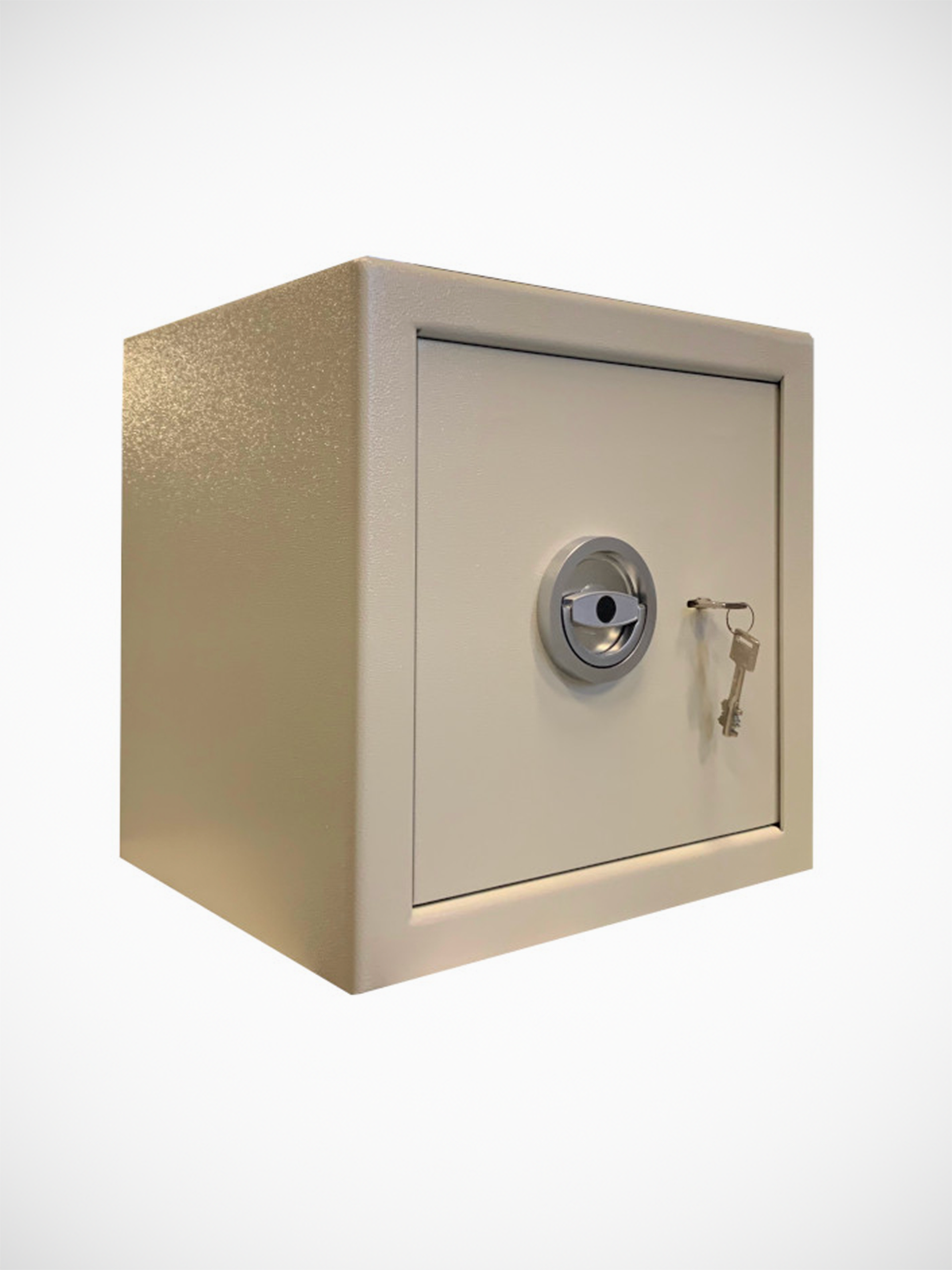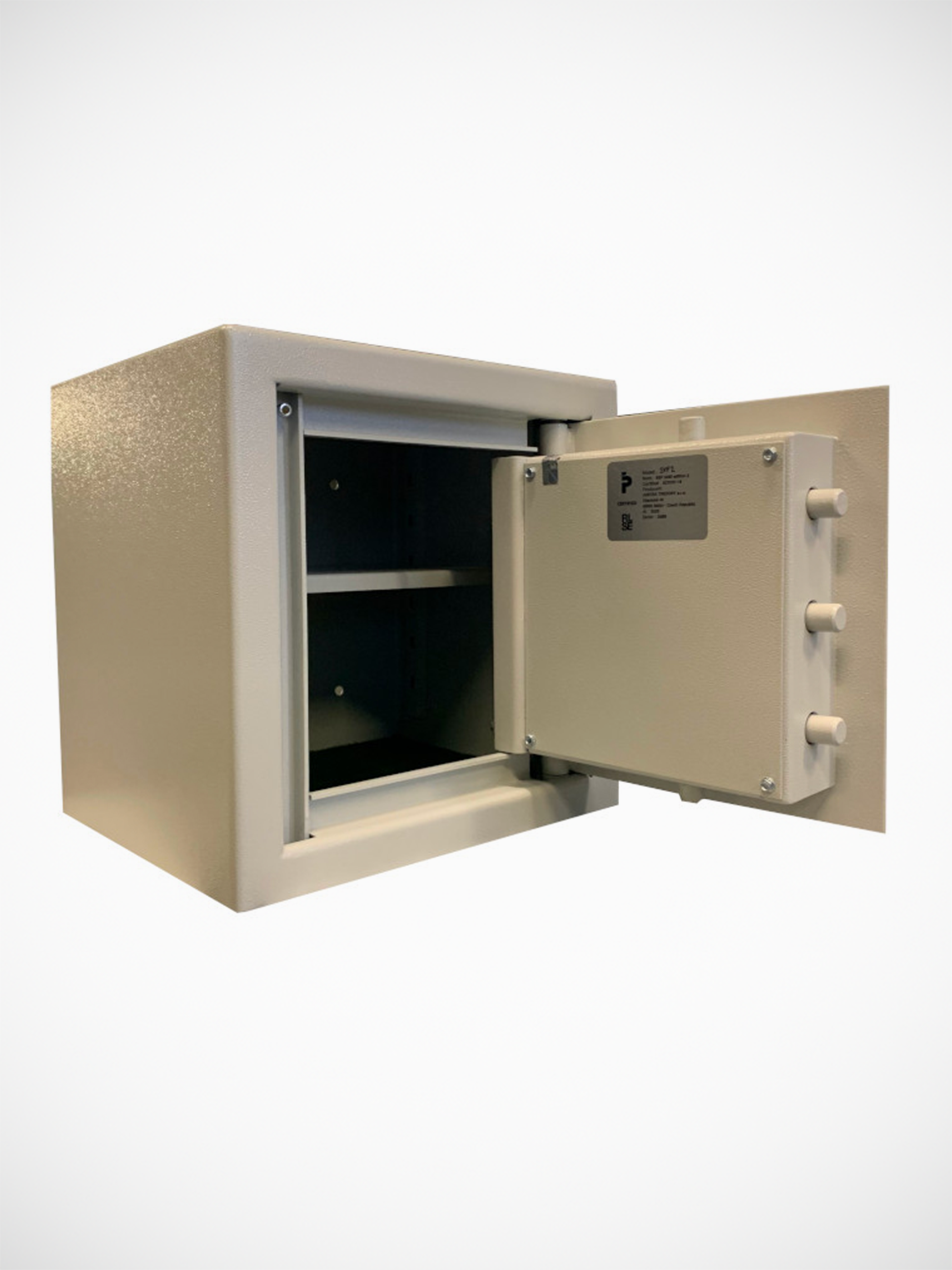 Skåpet är byggd i 4 mm helsvetsad stålkonstruktion, medans dörren är 6 mm och har ett väl säkrat låssystem, skyddat mot såväl borrning som manipulation, slag och brytning.