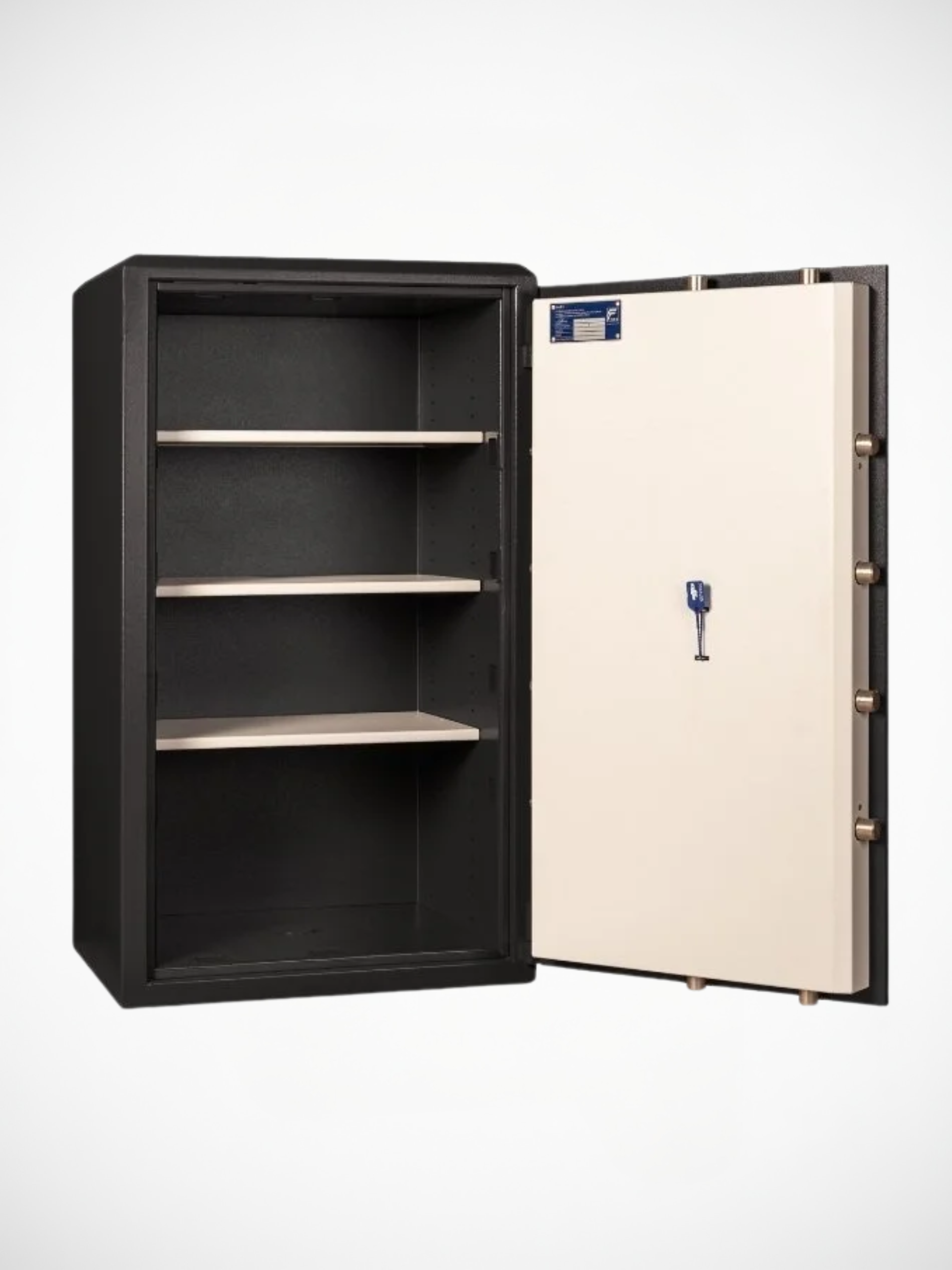 Skåpet är utrustad med högsäkerhetsklassat nyckellås enligt EN 1300 Klass B och 3 flyttbara hyllor. Kodlås eller dubbla nyckellås eller nyckellås + kodlås går att få som alternativ.
