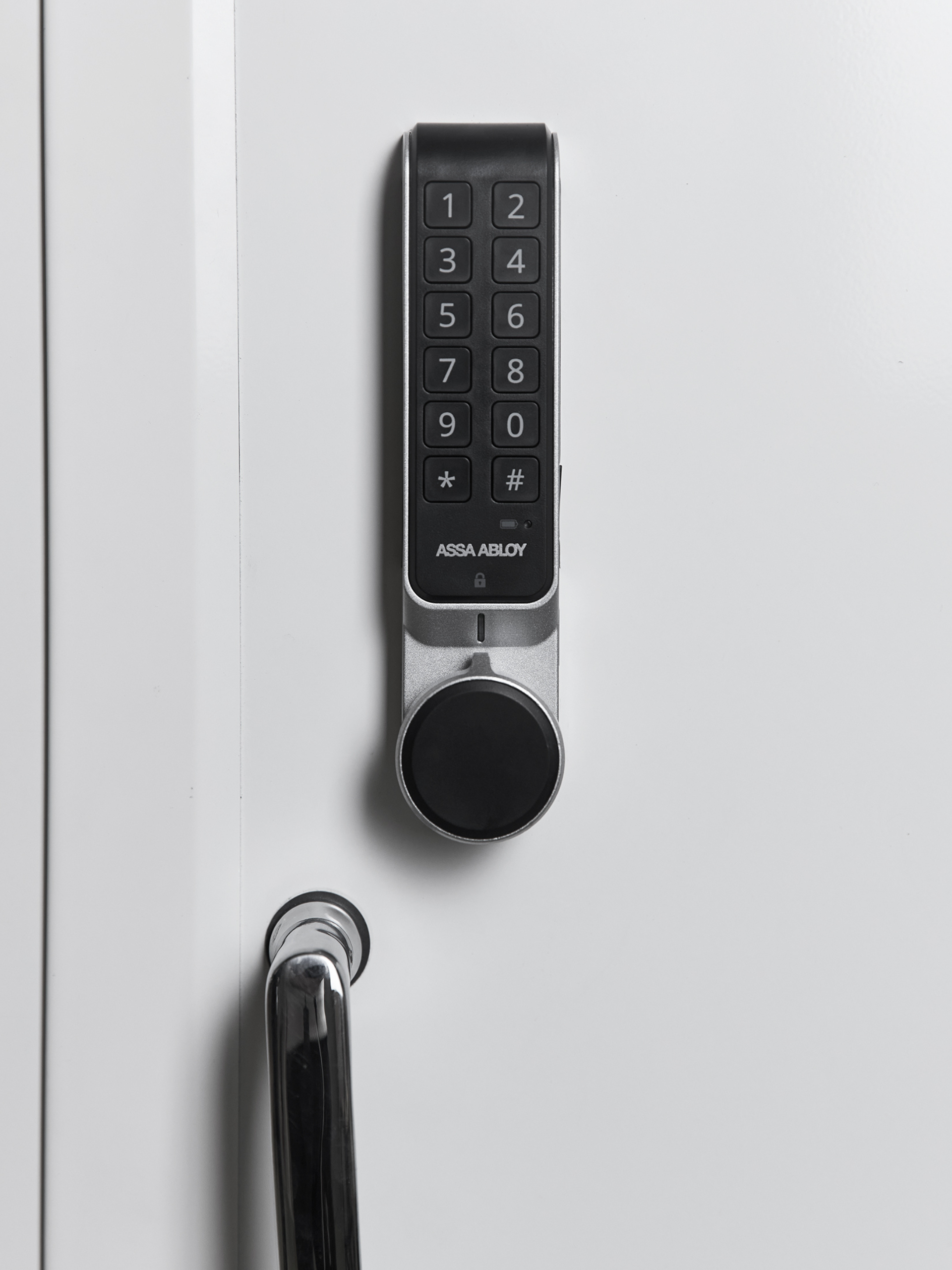 | Standardudstyr | Nøglelås med 2 nøgler, 1 flytbar hylde, alarm, alarmsensorer, strømskinne, advarselsskilte og ventilationskanal |