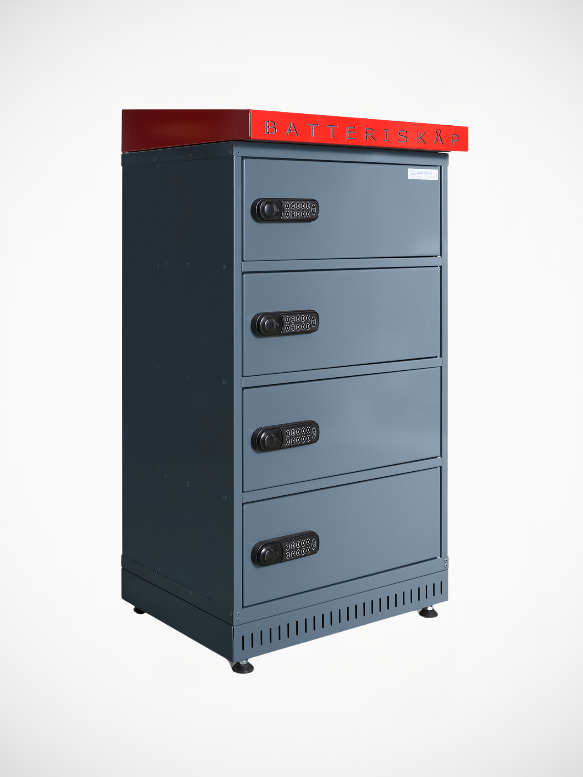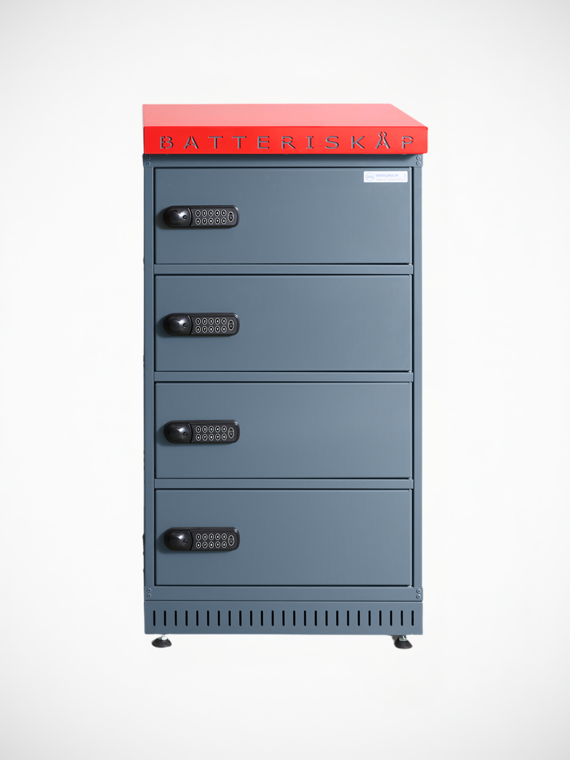 Moderne ladeskab til cykelbatterier. Skabet er ideelt for cyklister til at opbevare deres cykelbatteri, mens de f.eks. er inde i en butik, et indkøbscenter, en arbejdsplads, en skole eller andre offentlige bygninger. Hvert rum er udstyret med en stikkontakt, der giver dig mulighed for at oplade dit batteri, mens du er væk. Skabet skal hænges på væggen.