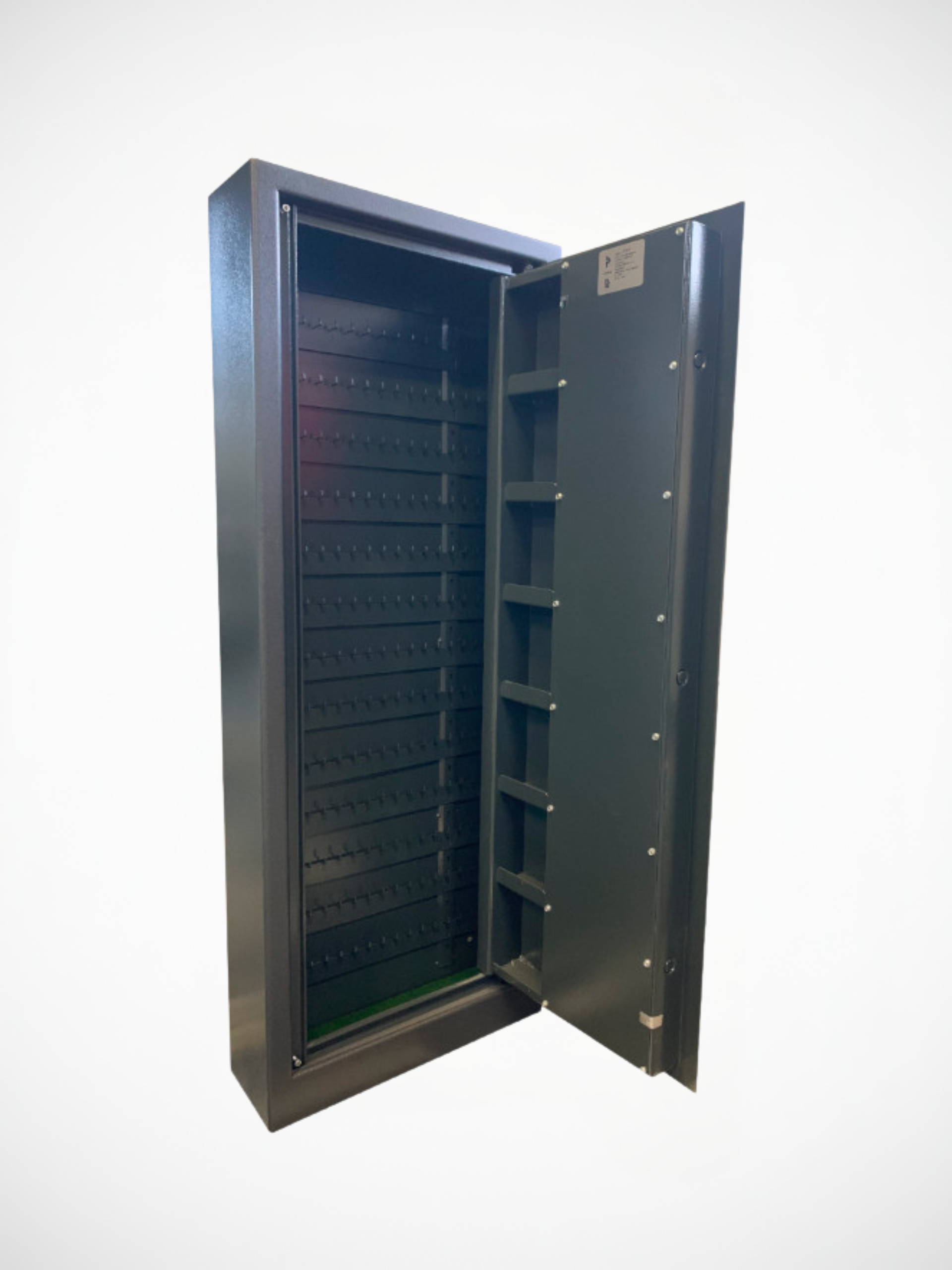 Skabet er bygget i 4 mm fuldsvejset stålkonstruktion og har et godt sikret låsesystem, beskyttet mod boring, manipulation, stød og brud.