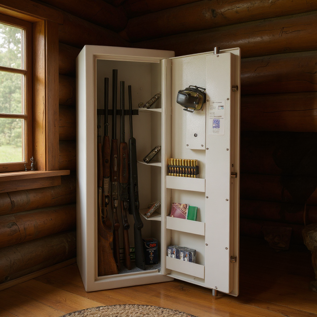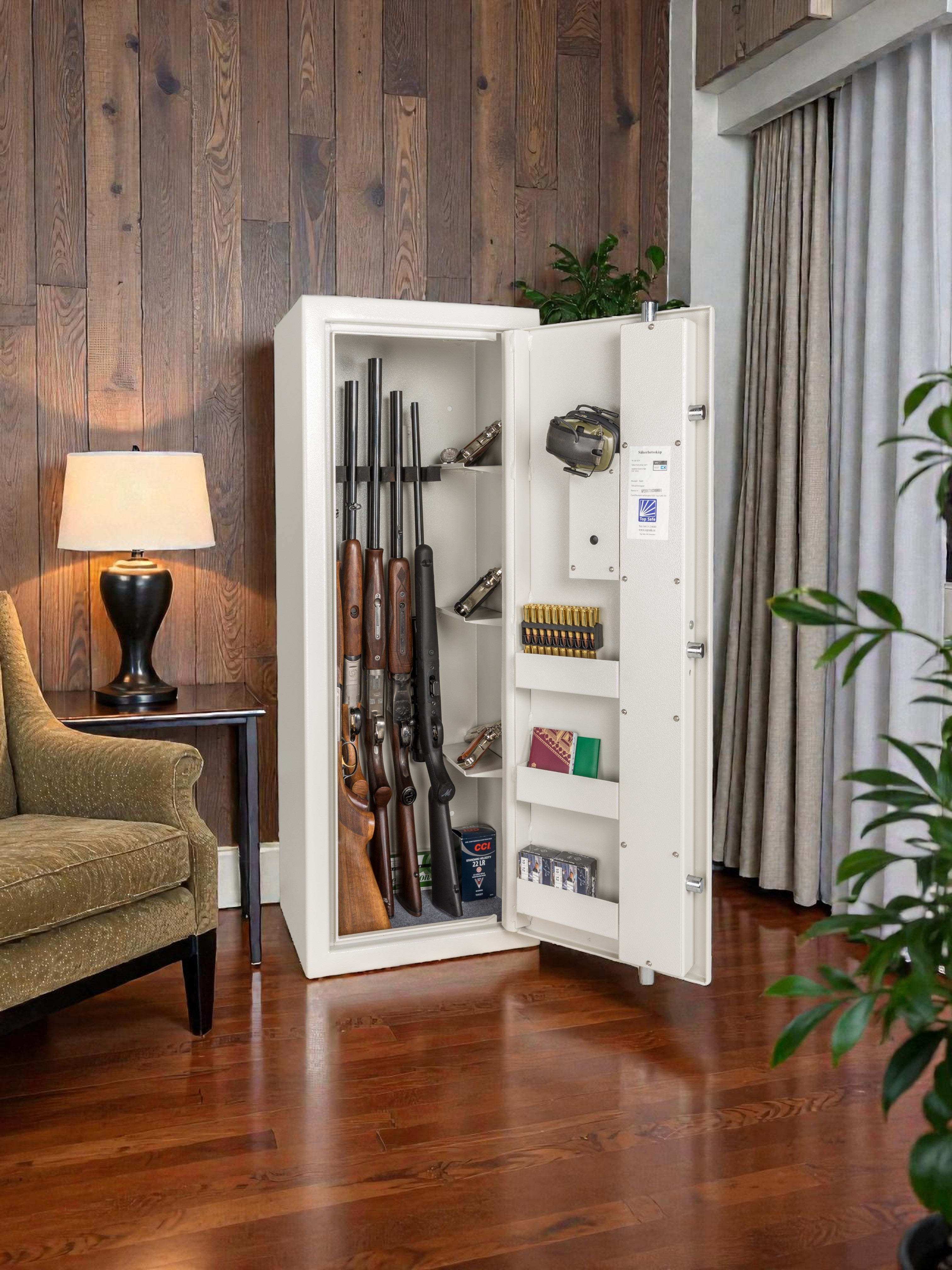 7-10 rifler, kodelås, 3 dørhylder, 3 sidehylder, 3 pistolholdere, kolbeunderlag, løbsstøtte, boltsæt, Producent: Top Safe