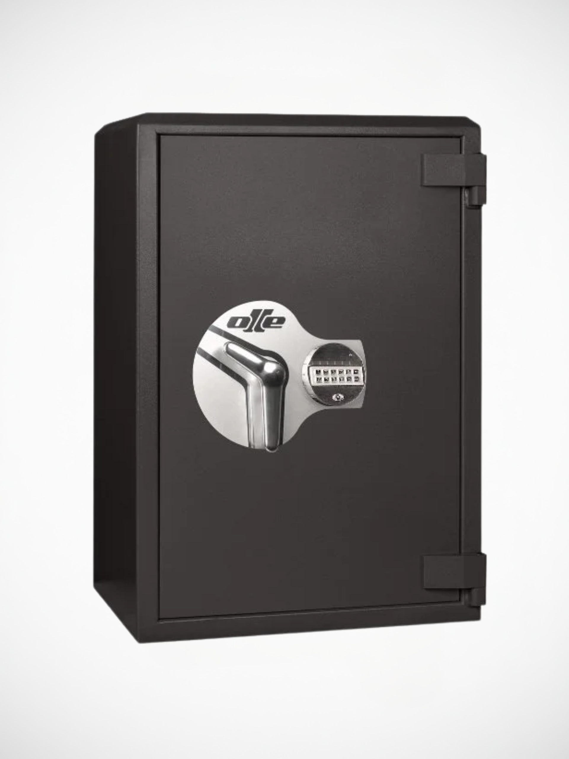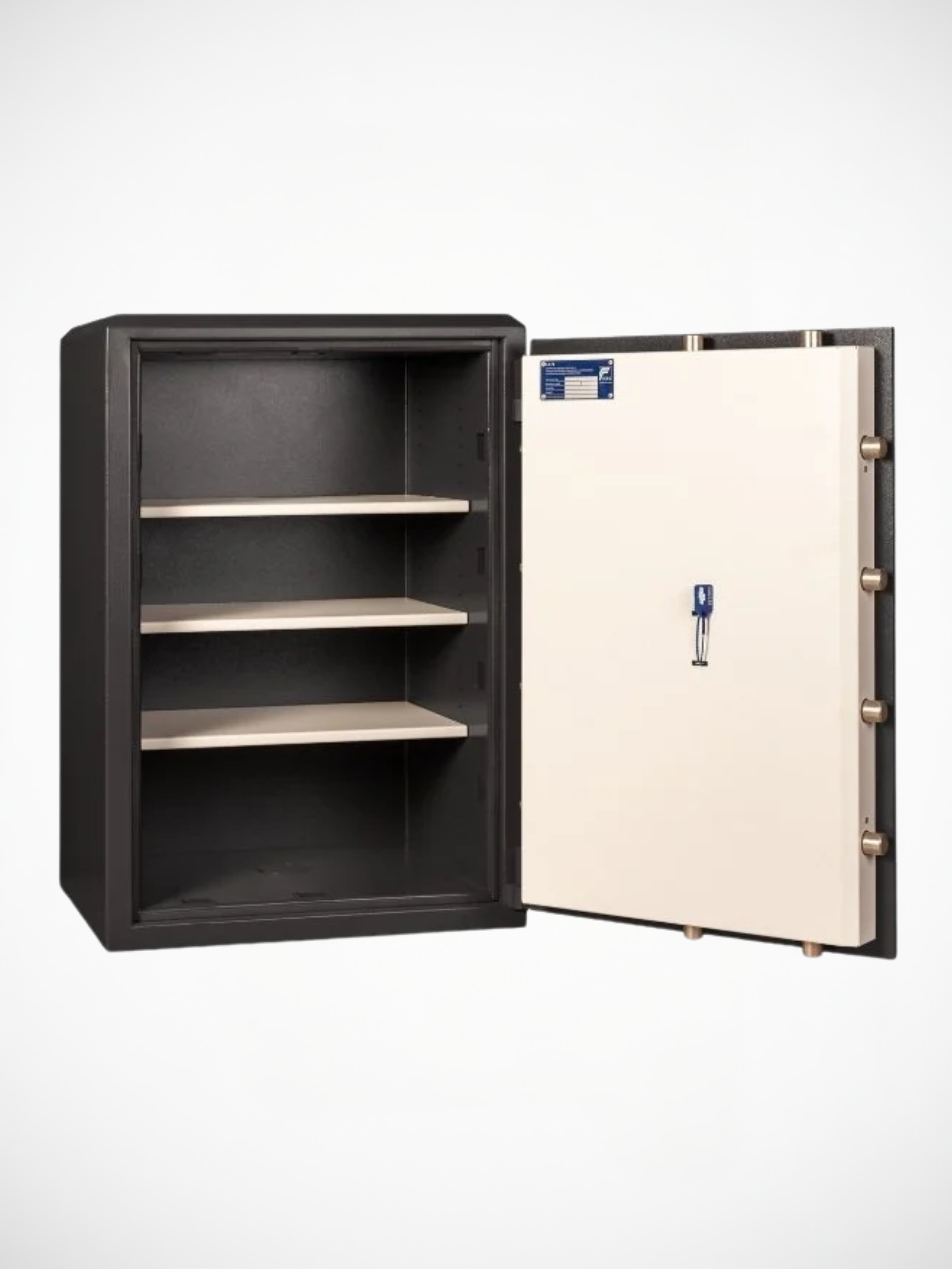Vahvat lukituspultit lukitsevat oven kolmesta suunnasta ja varmistavat oven kiinni kaapissa suljettuna saranoista riippumatta. Saranat on piilotettu karmiin turvallisuuden lisäämiseksi ja tyylikkäämmän muotoilun aikaansaamiseksi. Turvallisuuden lisäämiseksi kaappi on varustettu aktiivisella sulakkeella, joka on asennettu karmiin. Jos lukkoa yritetään manipuloida, karmi lukittuu ja murto estyy. Sekä lukko että karmi on vahvistettu porausnestolevyillä murtoyritysten estämiseksi.
